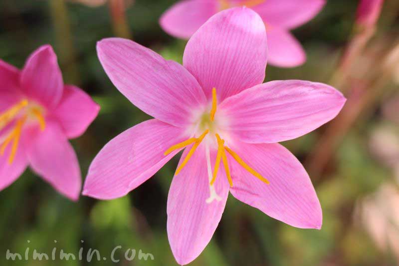 サフランモドキよりもやや濃いピンク色の花。 ・モモイロタマスダレ(Zephyranthes Taubertiana) ブラジル原産で寒さに強い。 ピンク色の花は1日でしぼむ。 春咲きで小輪、薄いピンク花の‘紅玉’や、夏咲きで大輪、濃いピンク
